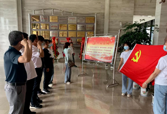 在莊嚴的紀念館序廳革命先輩浮雕前,全體黨員干部面對鮮紅的黨旗重溫了入黨誓詞。