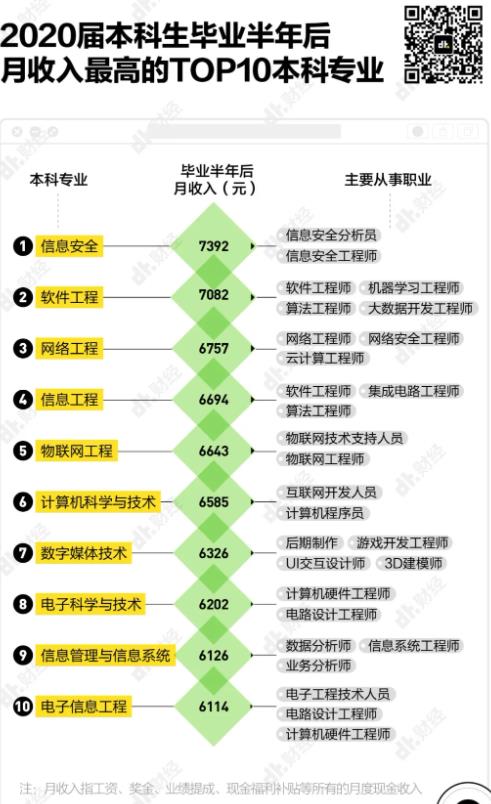 其中,信息安全和軟件工程的畢業(yè)生起薪最高,畢業(yè)半年后的月收入都超過7000元。